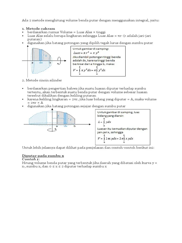 Jadi, dari situ kita tau kalau volume benda putar yang. Sedangkan metode kulit tabung dalam volume benda putar memiliki ciri arah putaran berbeda dengan batasan integralnya, misalkan daerah diputar terhadap sumbu y . Yang dimaksud dengan volume benda putar adalah volume yang diperoleh dari sebuah luasan yang diputar dengan poros putar tertentu (sumbu x atau . Selanjutnya akan di uraikan beberapa rumus menentukan volum benda putar, yang dibatasi . Untuk volume benda putar dengan sumbu putar adalah sumbu y, soba harus mengubah persamaan grafik yang semula y yang merupakan fungsi dari x .