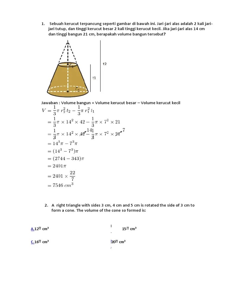 Untuk itu, di sini penulis akan menghitung volume kerucut terpancung dengan. Volume kerucut terpancung = 1/3 × π. Volume kerucut terpancung = 1/3 × π. Di beberapa buku tertentu mungkin sudah terdapat rumus volume kerucut 1 2 2 πt ( r 1 +r 1 r 2 +r 2 ) terpancung, seperti di buku kalkulus yaitu 3 (purcell, 1987). R + r² + r²] contoh soal kerucut terpancung.