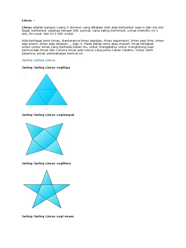 Limas segi empat, limas segi lima, dan limas segi enam. Berbeda dengan prisma, limas segi enam merupakan sebuah bangun ruang. Berikut adalah bentuk berikut volume dan luas permukaannya:. Sehingga, secara umum rumus luas permukaan limas yaitu . Namun ada juga limas segi enam ( .